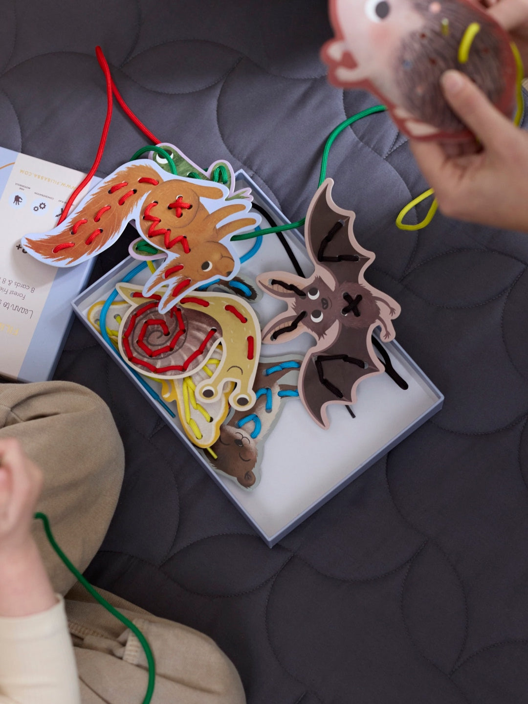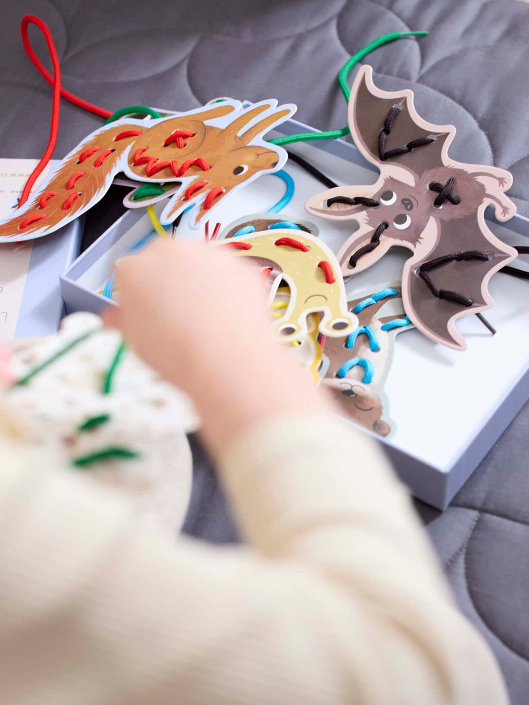 Värvilised paelad põimitakse sõrmede abil eelnevalt augustatud kaartidesse, millel on kaheksa kaunilt käsitsi illustreeritud looma. Nii saad luua kauneid mustreid ja samal ajal arendada käelist osavust.